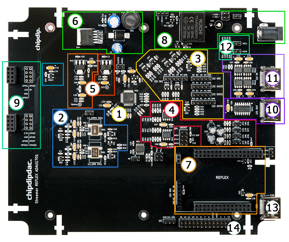 - DC-DC 5V converter for powering the power management module (8), REFLEX and I2S via HDMI circuits