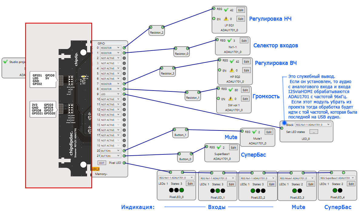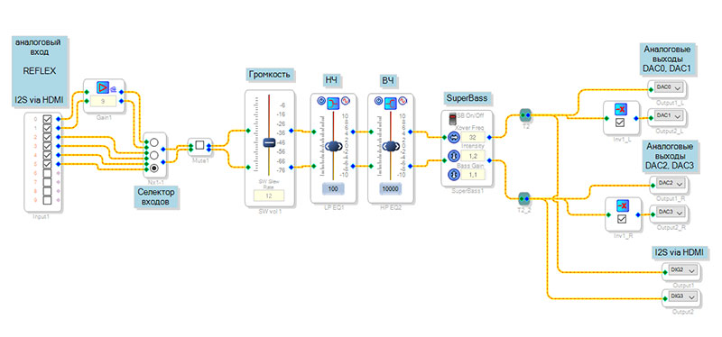 After uploading the project to Reflex, we will get a timbre block with analog and digital inputs, analog outputs, and adjustments: input selection, volume, bass, treble, Mute, and SuperBass timbres.